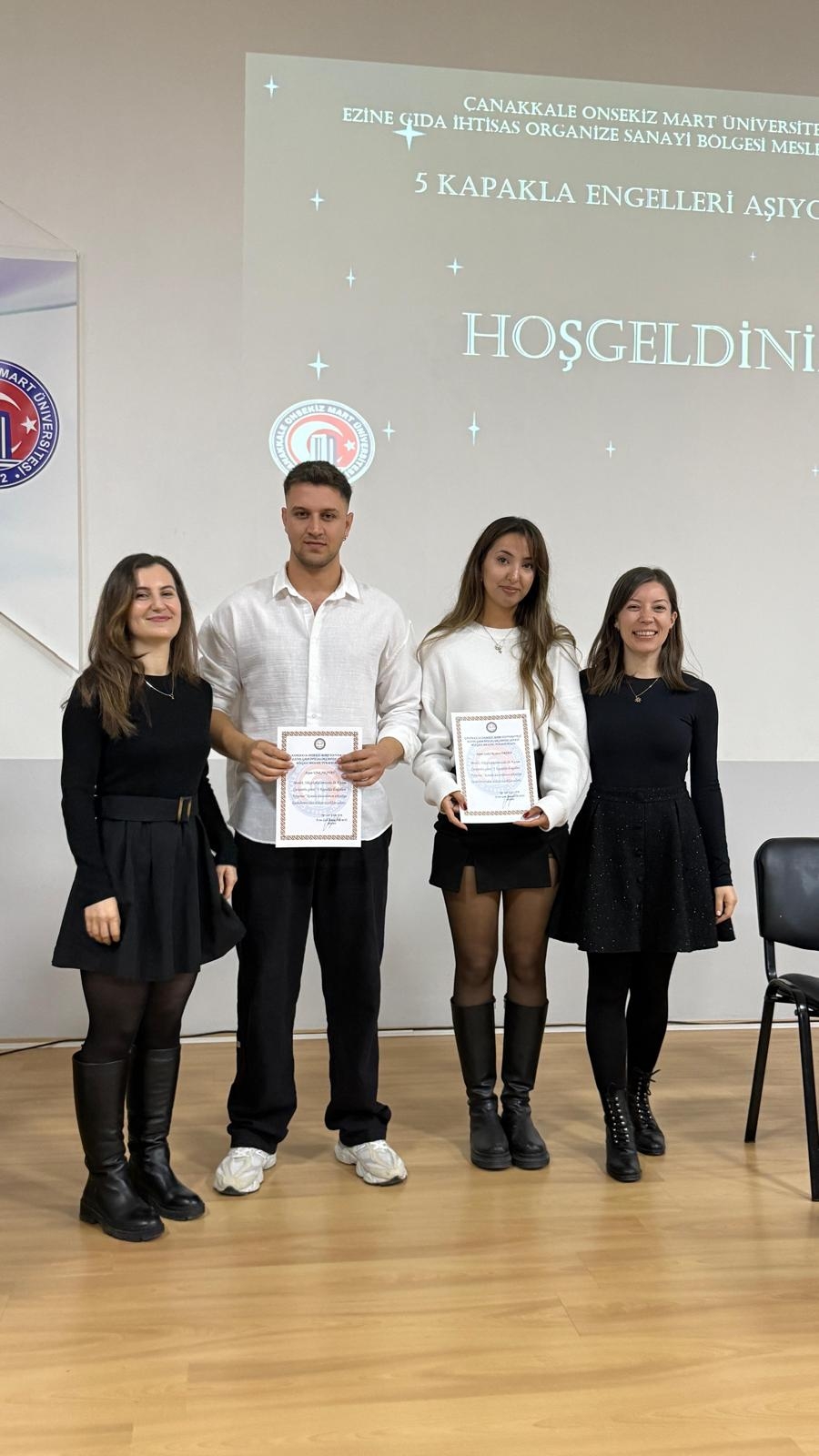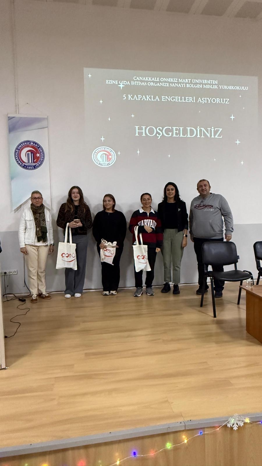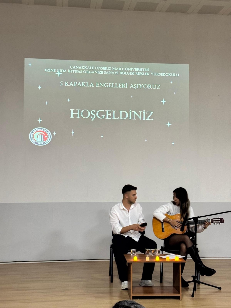Ezine Gıda İhtisas OSB Meslek Yüksekokulu Pazarlama ve Reklamcılık öğrencileri, sosyal sorumluluk ve etik dersi kapsamında anlamlı bir etkinlik düzenledi. “5 Kapakla Engelleri Aşıyoruz” temalı programda, konser biletleri yerine tekerlekli sandalye ve yardımcı cihaz alımında kullanılmak üzere 5 adet mavi kapak bağışı kabul edildi. Gerçekleşen mini konserde öğrenciler sahne alarak keyifli anlar yaşattı. Etkinlik sonunda toplanan mavi kapaklar geri dönüşüm kutusuna teslim edilerek kampanyaya destek sağlandı.