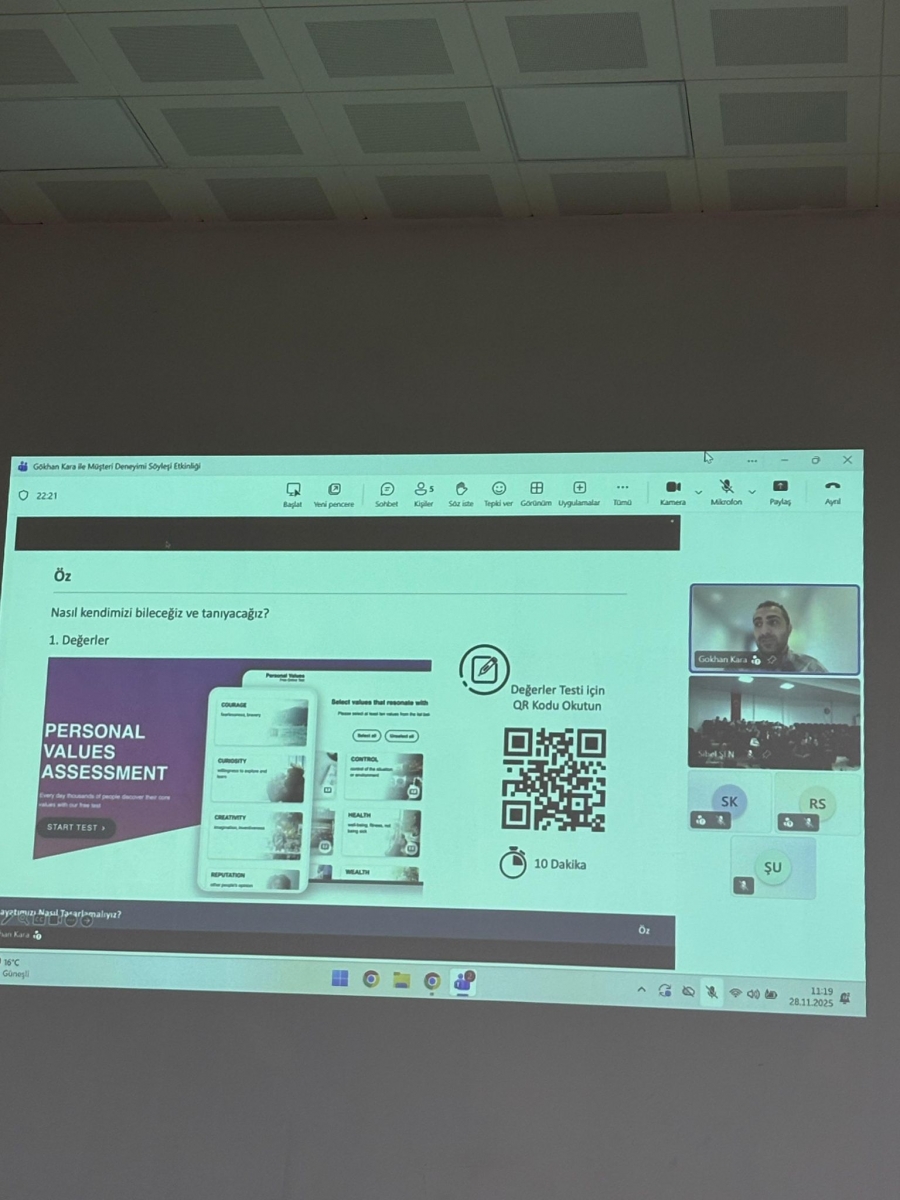 Pazarlama ve Reklamcılık Bölümü öğrencilerinin katılımıyla düzenlenen webinarda, müşteri deneyimi alanında yazdığı kitaplar ve sektördeki çalışmalarıyla tanınan Gökhan Kara, kendi kariyer yolculuğundan ilham veren örnekler paylaştı. Kara, müşteri deneyiminin işletmeler için neden stratejik bir değer haline geldiğini açıklarken, hem kişisel gelişim sürecinden hem de kitaplarının oluşum aşamalarından bahsederek öğrencilere yol gösterici bilgiler sundu.